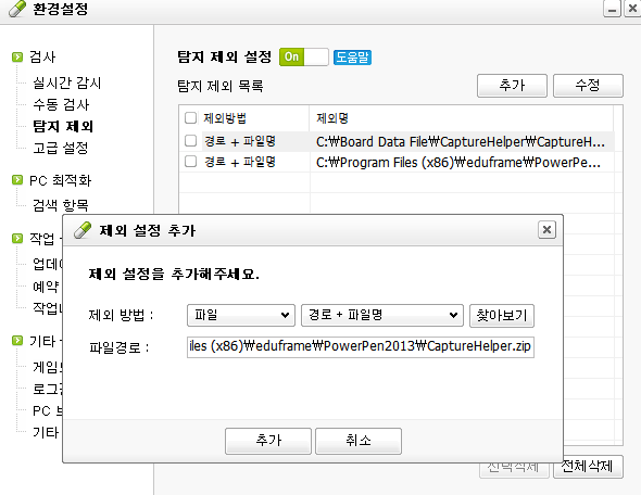 이는 실제 바이러스가 아니오니 안심하시기 바라며, 원활한 사용을 위해 아래와 같이 [탐지 제외] 설정을 진행해 주시기를 부탁드립니다.