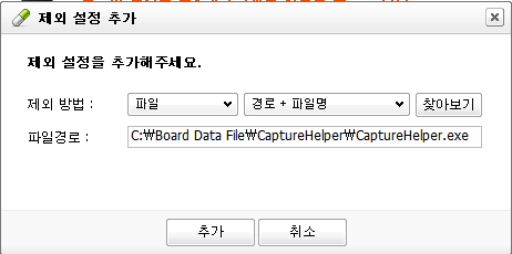2.[추가] 버튼을 눌러 아래 경로에 있는 CaptureHelper.exe 파일을 등록합니다.